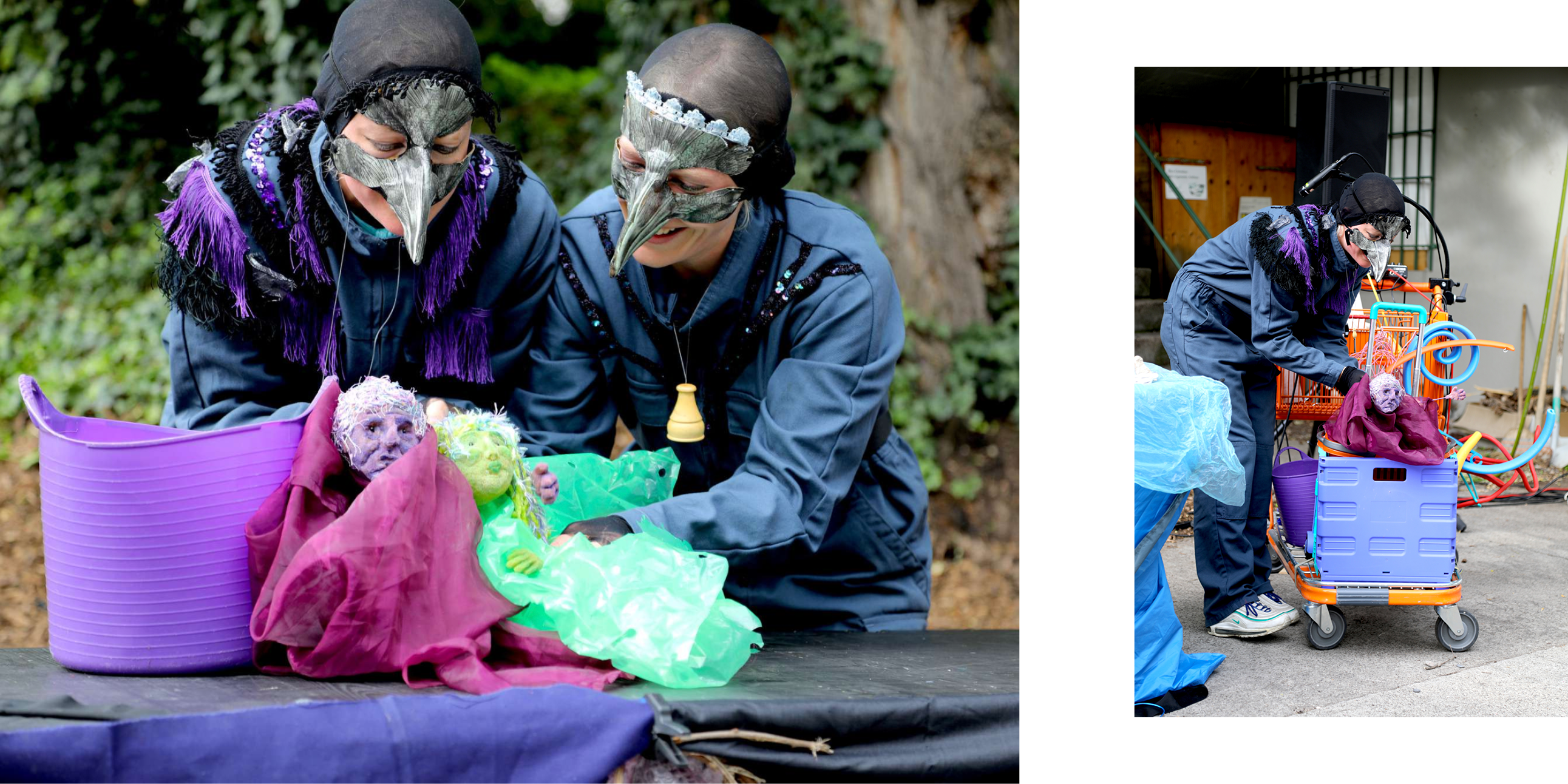Deux comédien·nes masqué·es, incarnant des oiseaux, viennent partager ce conte initiatique à la fois écologiste et féministe. Depuis leur nid mobile, iels créent la musique faite de samples d’oiseaux en direct tout en manipulant des marionnettes humaines d’environ 30 cm. Le spectacle joue avec les changements d’échelle, les interactions entre les différentes tailles et leur renversement, dans un esprit ludique et inventif.