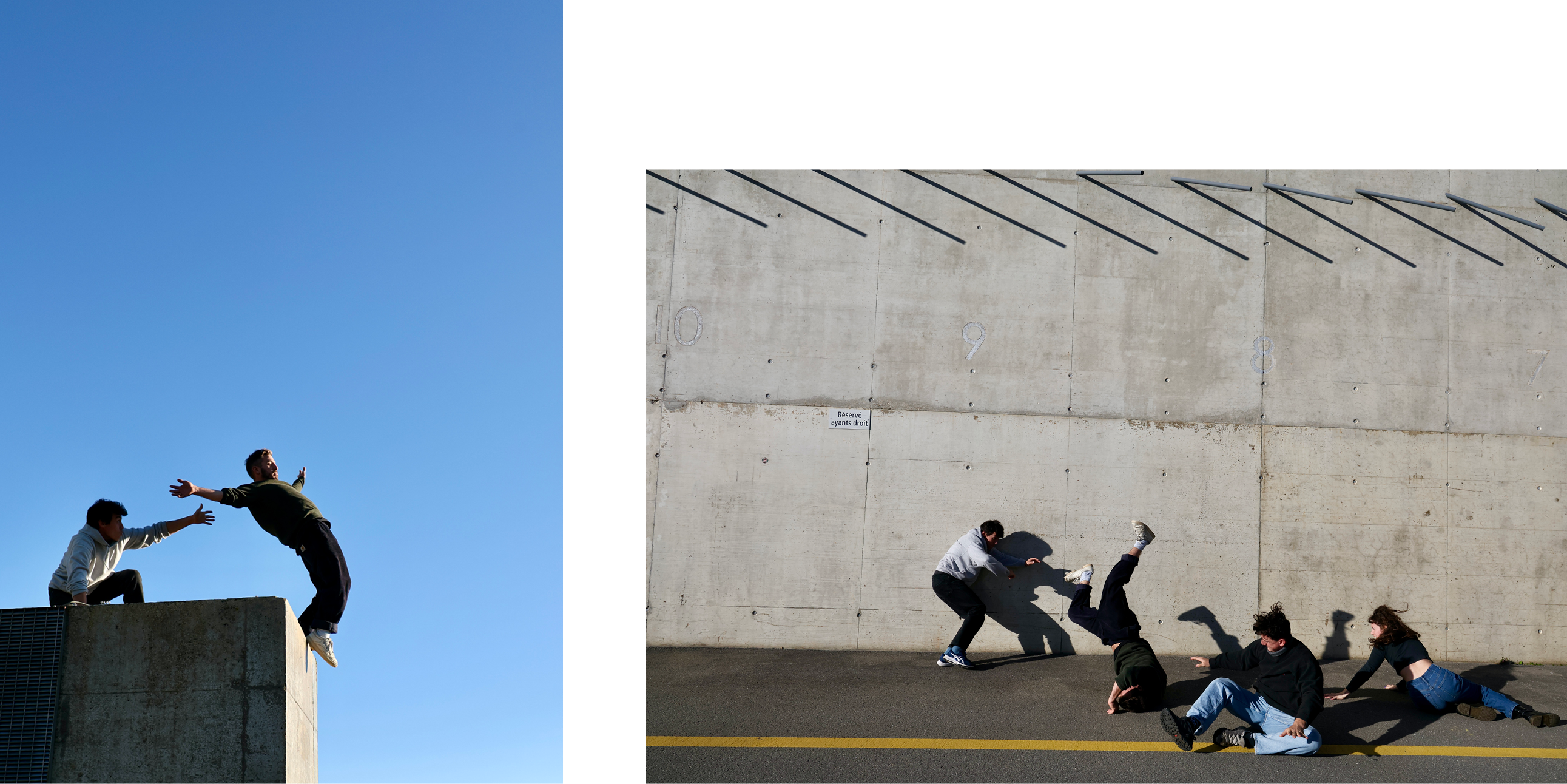 Sauter, rouler, tomber, se rattraper : une partition physique, rythmique et visuelle se déploie, portée par une joie tenace. Le mobilier urbain — portes, lampadaires, escaliers — devient partenaire de jeu et terrain d’écriture.